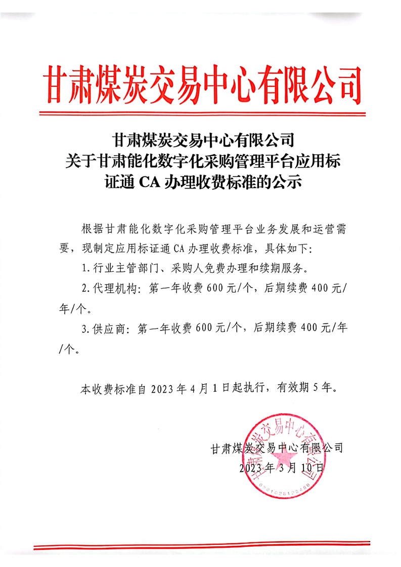 關(guān)于甘肅能化數(shù)字化采購(gòu)管理平臺(tái)應(yīng)用標(biāo)證通CA辦理收費(fèi)標(biāo)準(zhǔn)的公示